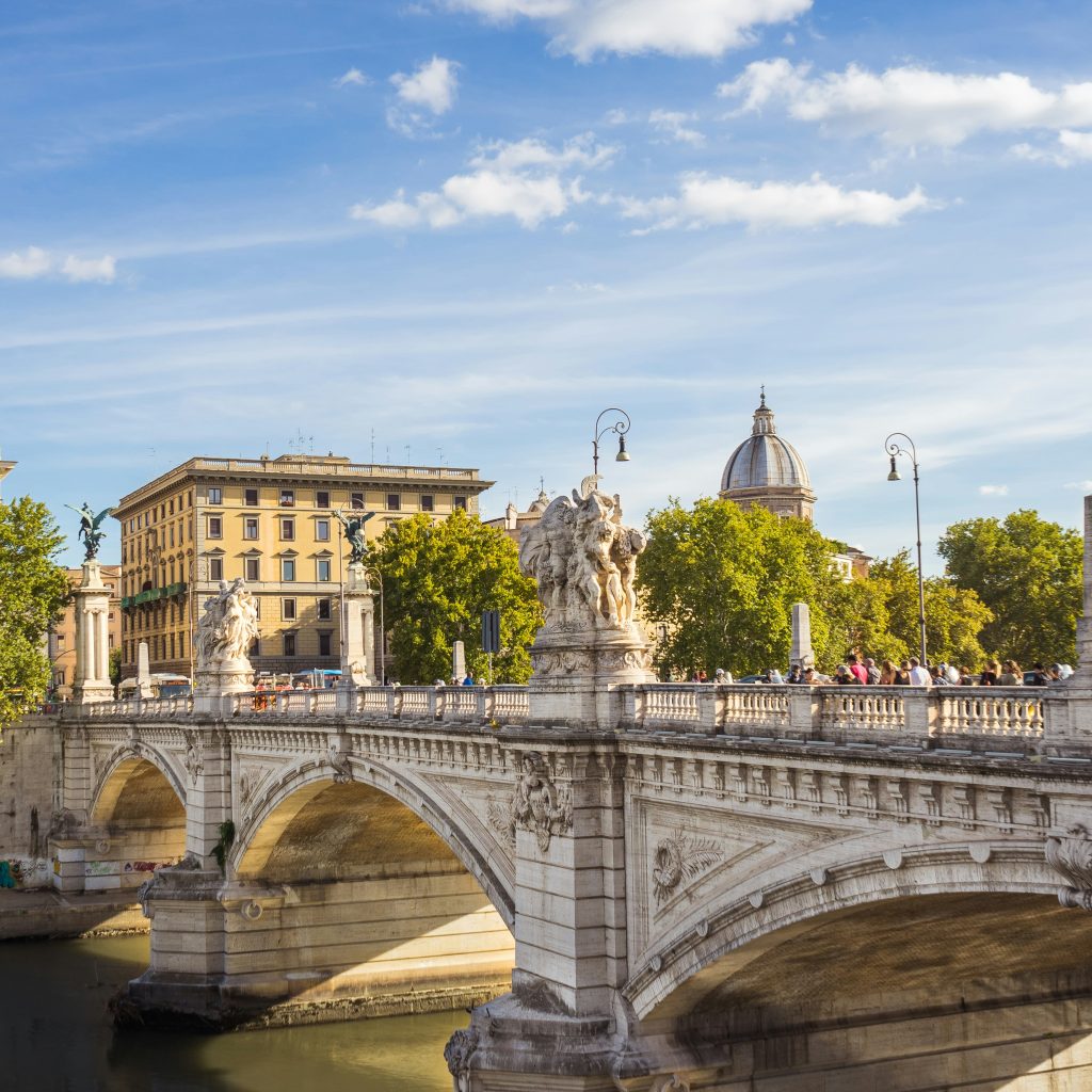 Paseo nocturno por el Puente Sant’Angelo iluminado.